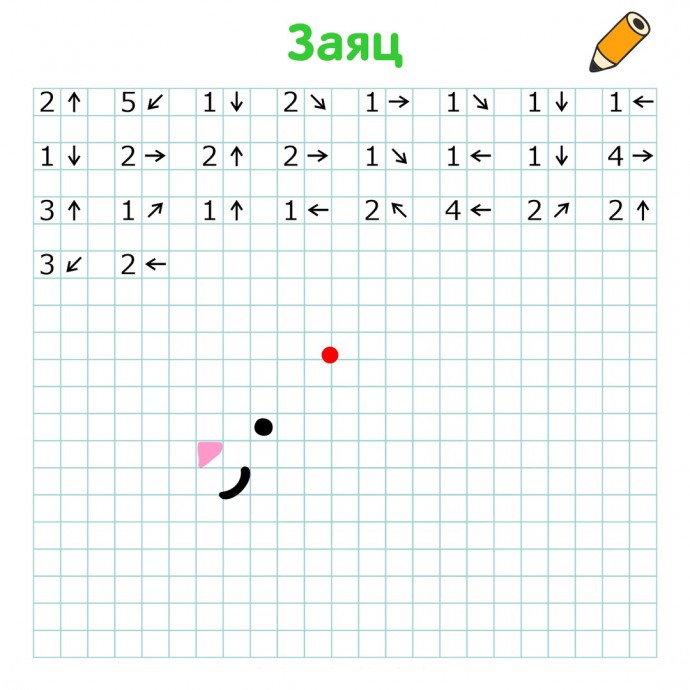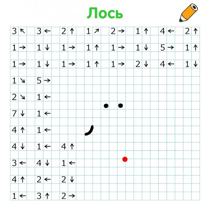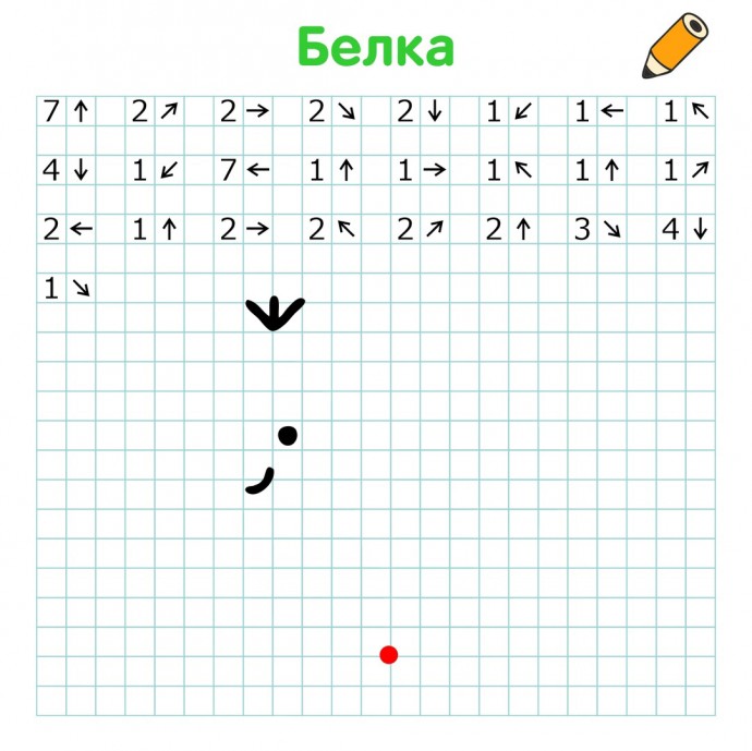 Распечатайте шаблоны и предложите ребёнку рисовать по клеточкам, как подсказывают цифры и стрелки. Цифра обозначает количество клеток, а стрелка — направление движения ручки. Начинать рисовать следует от красной точки. Готовые рисунки — на обложке.