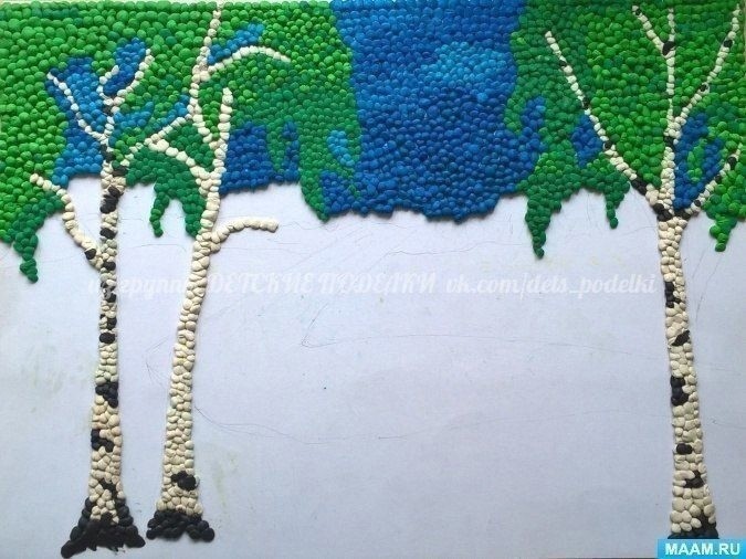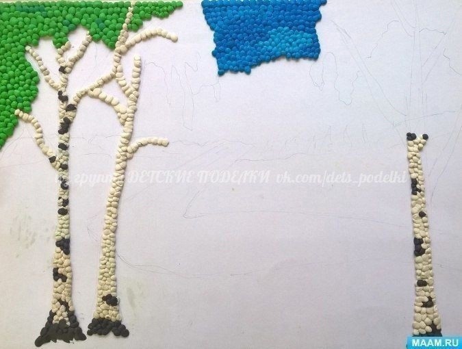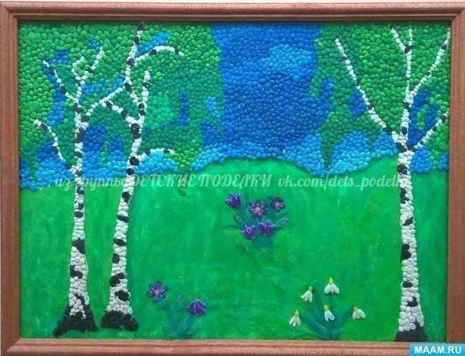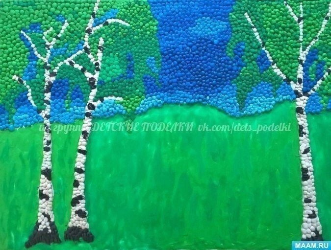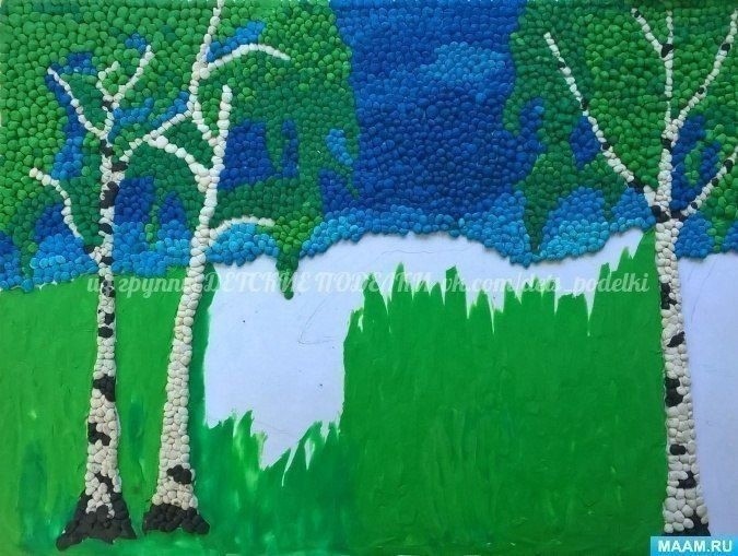 Открытка с объёмными берёзками дополнена синим небом и цветочками.