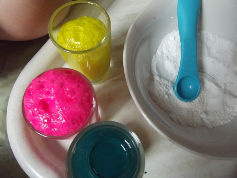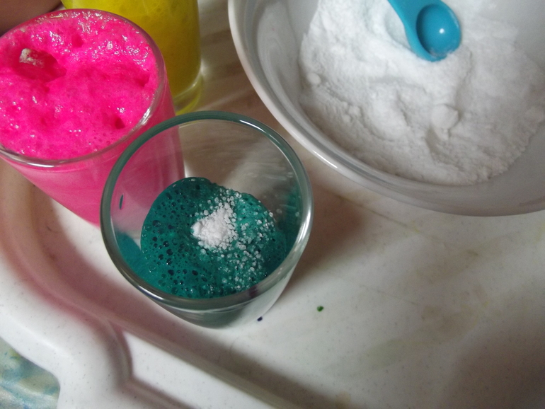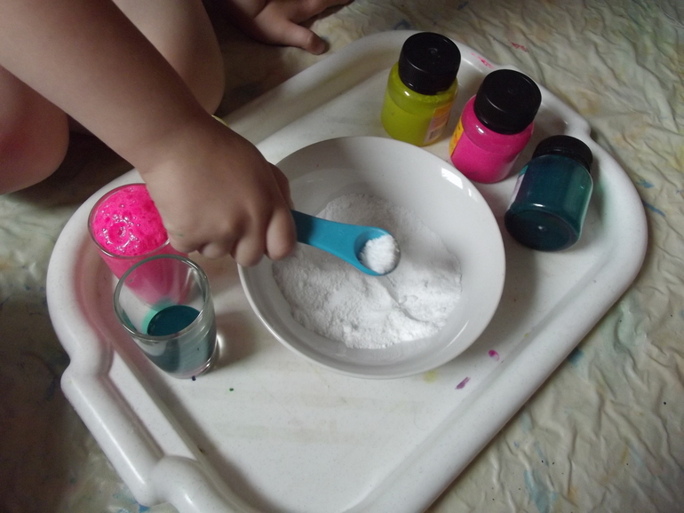 В воду добавляем красители или краски до насыщенного оттенка . Выдаем малышам смесь соды и кислоты , ложки .