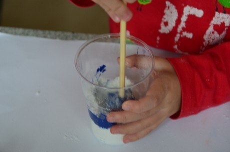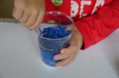 Насыпаем соль в стаканчик (или куда хотите), кладем туда ложку краски, и тщательно перемешиваем.