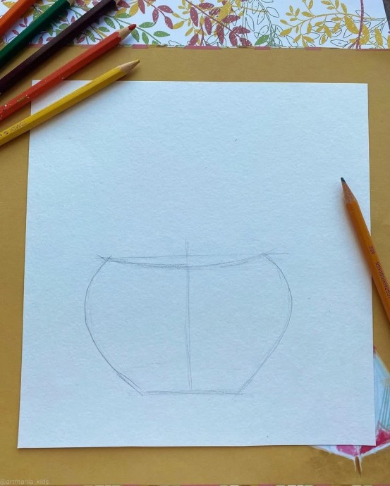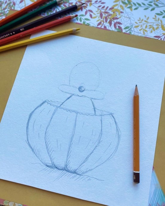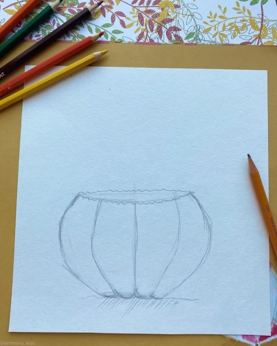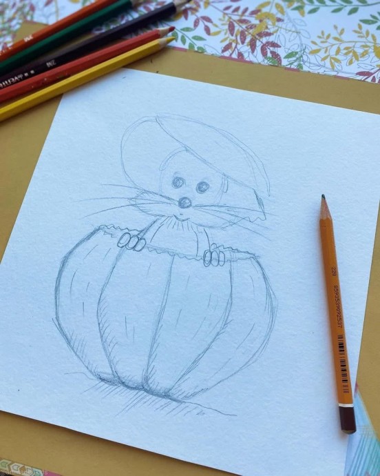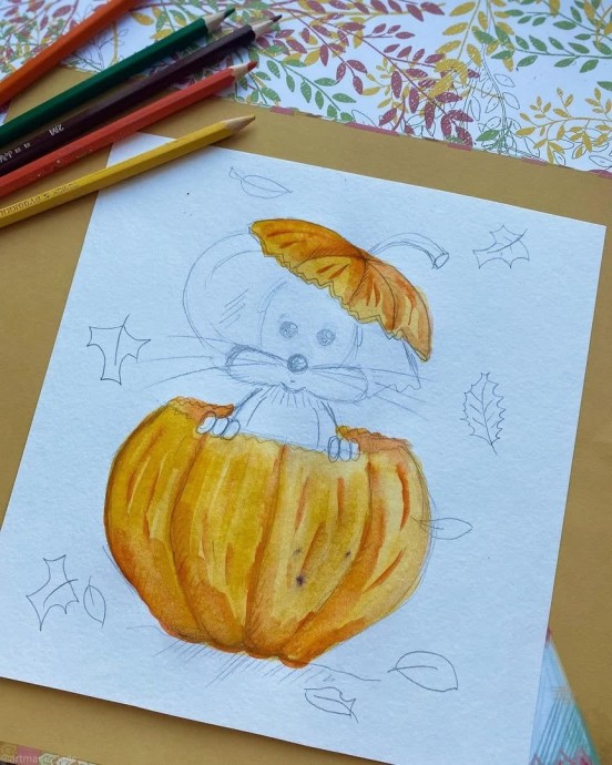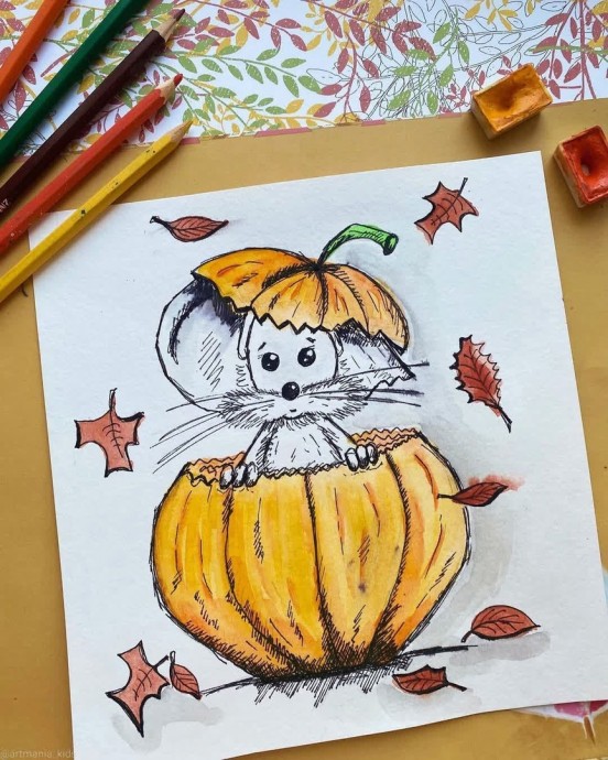 Рисуем ушастого мышонка, который спрятался в тыкве и теперь выглядывает из него.