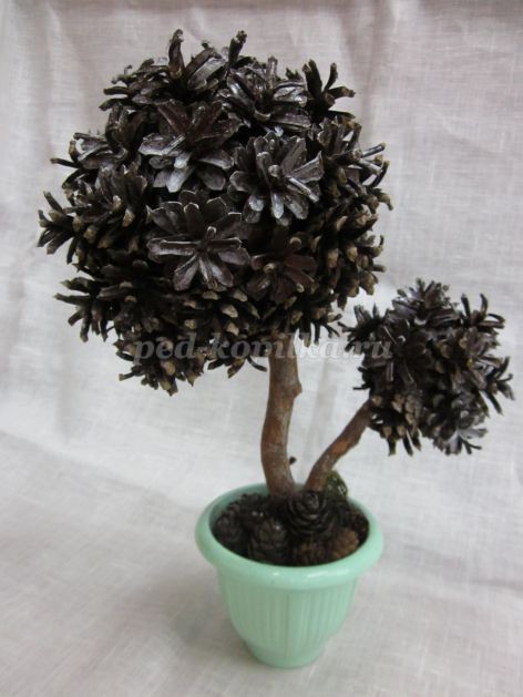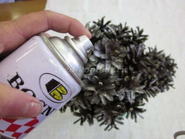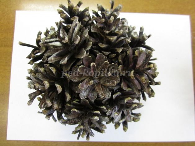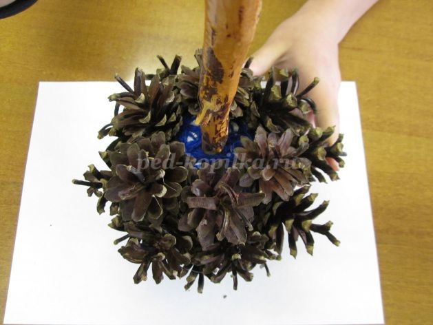 4. Приклеить сосновые шишки на клубок, как можно ближе друг к другу.