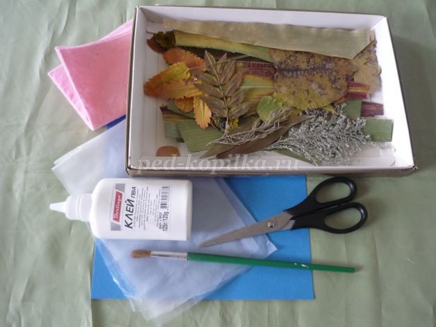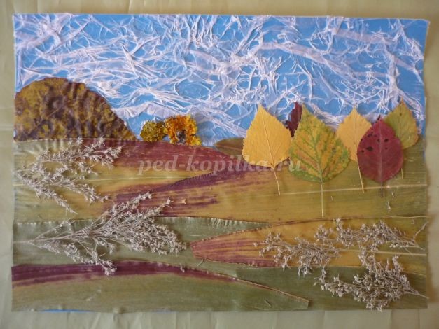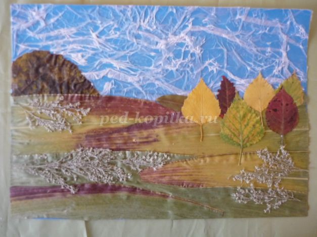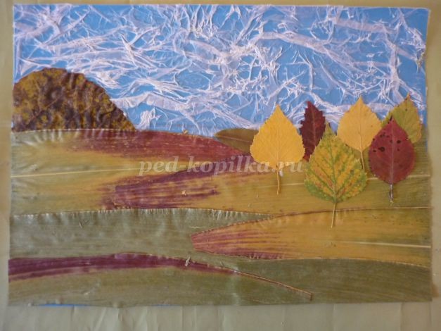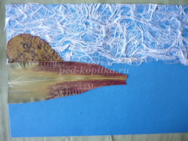 Раскладываем засушенные листья кукурузы, имитируя поля, половину листа тополя - пригорок. Таким образом создаём с помощью листьев предварительный рисунок.