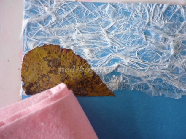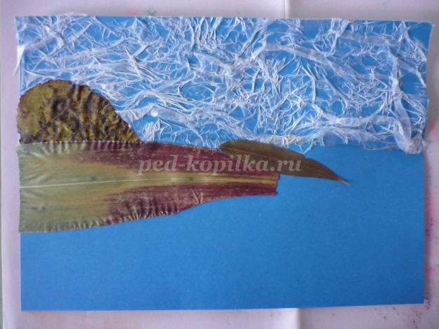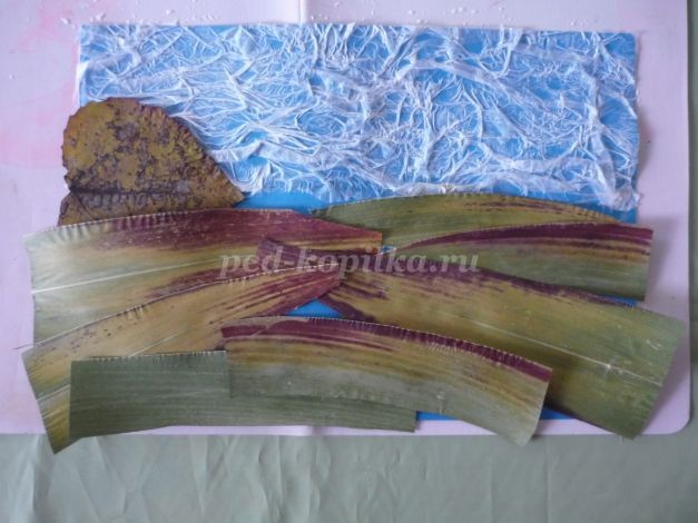 Намазываем клеем следующий лист, наклеиваем аналогичным образом. Рядом приклеиваем лист ивы, создавая рисунок горизонта.