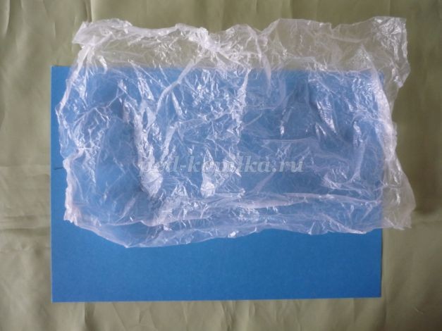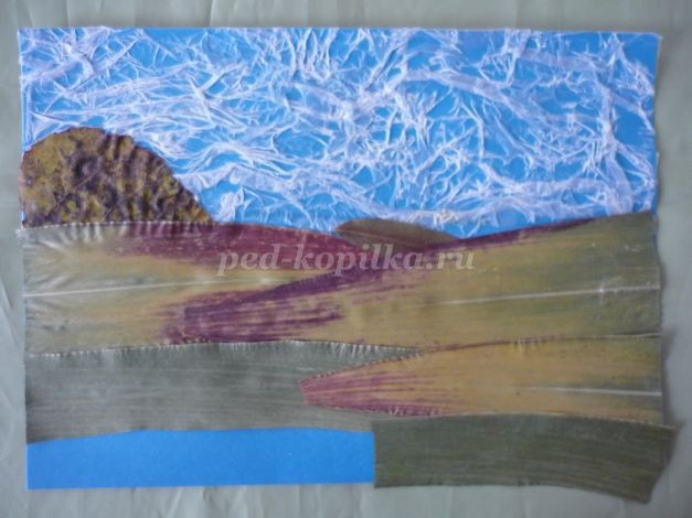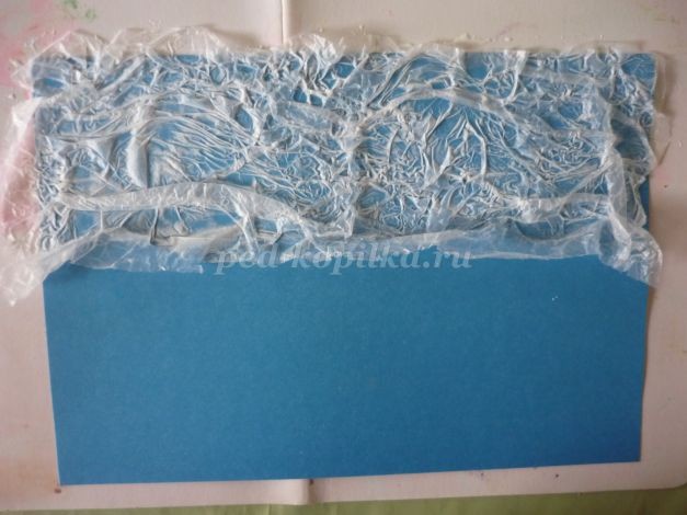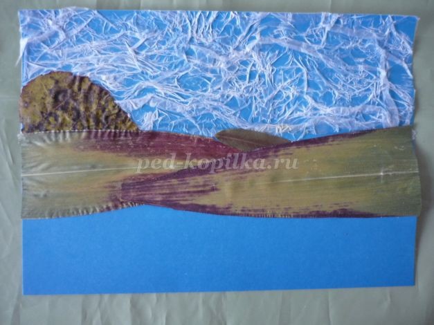 Намазываем клеем будущее небо, наклеиваем жатую кальку, формируя мелкие складочки. Кальку хорошо прижимаем тряпочкой. Обрезаем лишнее по краям. Получились перистые облака.