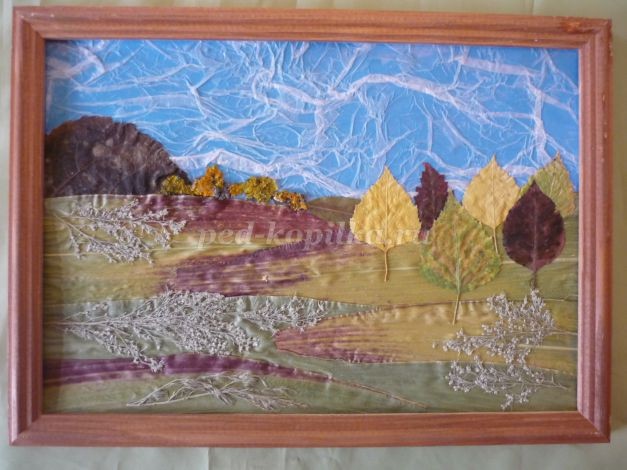 Следующий этап: раскладываем листья берёзы и другие мелкие листики другой формы, имитируя деревья; веточки полыни, имитируя травы на поле. Листья меньшего размера располагаем ближе к линии горизонта, а большего размера - ниже предыдущих листьев.