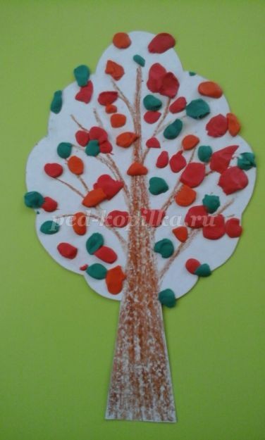 Теперь берем пластилин зеленого цвета и наполняем наше дерево зелеными комочками-листочками. Не забываем прижимать листочки к основе пальчиком.