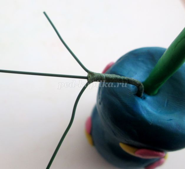 5. Цветок «одевают» на стебель. Цветок при этом слегка вдавливается в зеленый шарик - чашелистик.