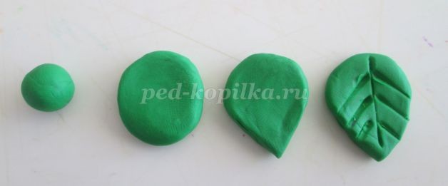 6. Берем кусочек пластилина зелёного цвета в диаметре не больше сантиметра. Катаем сначала в шарик, затем расплющить его. Большим и указательным пальцами заострить кончик листа. Получился листок. Стекой делаем прожилки.