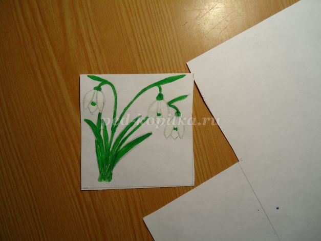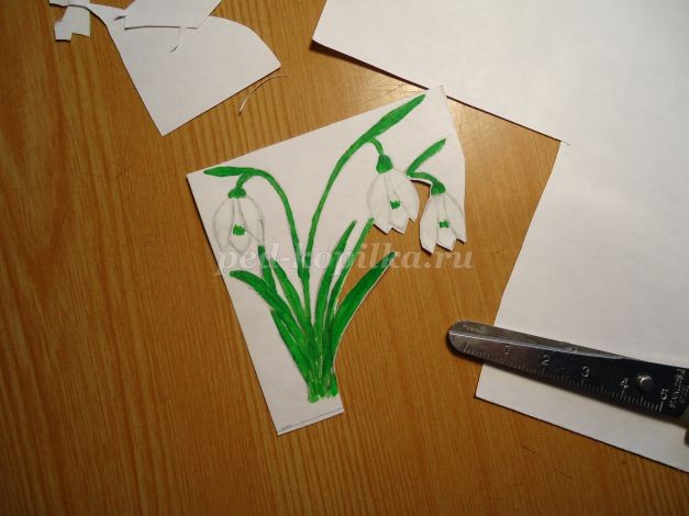12. Коробочка раскрашена. Переходим к работе в технике декупаж, начинаем вырезать подснежники. Поскольку рисунок маленький, то сначала мы отрезаем цветы с охватывающей их площадью от листа.