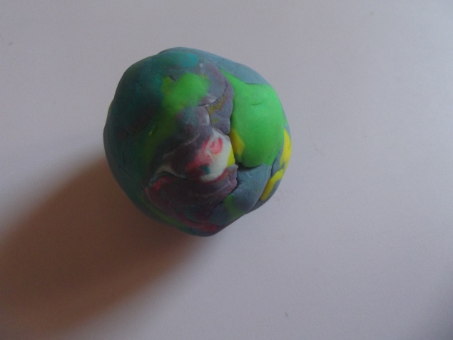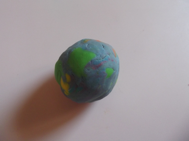 Мы смешали синий , зеленый , желтый . Скатали шар и получился макет Земли из пластилина .