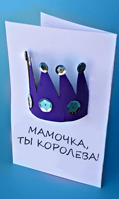 Корона станет настоящим украшением открытки, если при ее создании использовать кусочки фольги и другие яркие декоративные элементы. Мамин портрет просто рисуем красками, фломастерами или карандашами, приложив к этому максимум усилий.