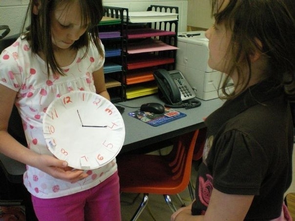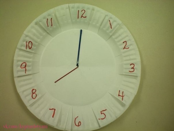 Не так-то просто на самом деле объяснить маленькому ребенку, как устроено время. Почему взрослые глядя на часы говорят "двадцать минут", хотя на часах всего 12 цифр? Или еще загадочнее: "без пятнадцати семь", например? С помощью такого нехитрого приспособления из двух бумажных тарелок вам наверняка станет проще научить ребенка определять время с точностью до 5 минут. Соедините вместе две бумажных тарелки одинакового размера, на верхней тарелке напишите обычный циферблат, как на часах, сделайте по краям тарелки надрезы, чтобы можно было загибать язычки с цифрами. А под ними на нижней тарелке напишите время с пятиминутным шагом, в соответствии с цифрами на верхней тарелке. Часовой механизм можно сделать из простых полосок картона.