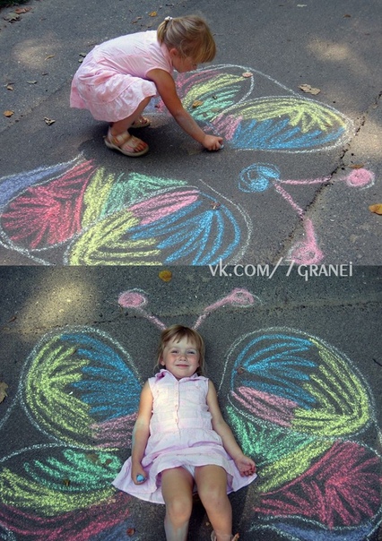 11. Рисовать можно не только на горизонтальной поверхности, но и на вертикальной. Например, на стене дома или стволе дерева. Можете не волноваться, первый же дождик сотрет следы вашего творчества.