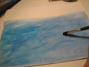 Сюжет этой аппликации вполне обычен - рыбки в воде, а вот исполнение - очень даже оригинальное. Сделать фон можно двумя способами - наклеить синюю и голубую бумагу на лист картона (море и небо) или нарисовать его акварельными красками.