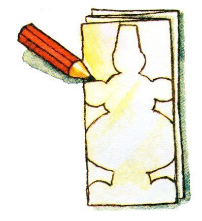 4. Вырежем снеговика, не разворачивая гармошку. (Внимание: не обрезайте до конца детали на сгибах, чтобы получилась единая цепочка.)