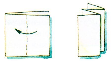 2. Сложим пополам по длинной стороне белую бумагу размером 10X20 см. Разделим пунктиром пополам наружные стороны и отогнём края к центральному сгибу. Получилась небольшая гармошка.