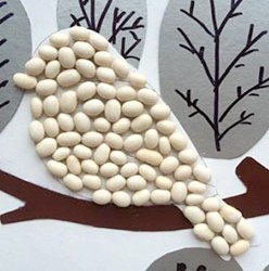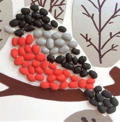 3. Смазываем клеем по одной «части» снегиря и приклеиваем на нее белую фасоль.