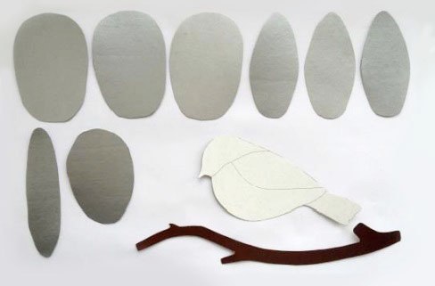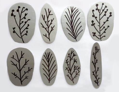 1. Берем заготовки из серебряного картона и черным маркером рисуем на них стволы и ветки деревьев. Берем ветку и приклеиваем ее в центр белого картона к правому краю. Затем приклеиваем деревья, оставляя место для птички.