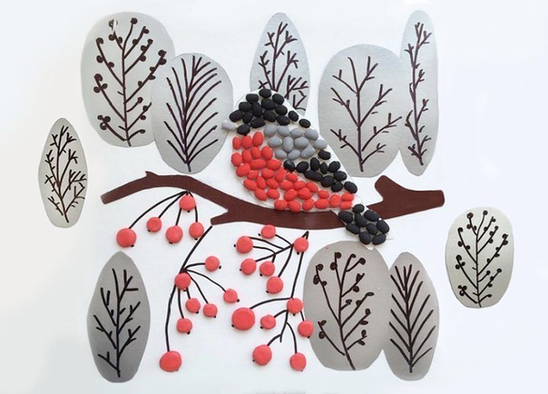 5. Черным маркером рисуем тонкие веточки от большой коричневой. Из красного пластилина катаем шарики разного размера, кладем их на веточки и приминаем пальчиками. Черным маркером рисуем у каждой рябинки точку.
