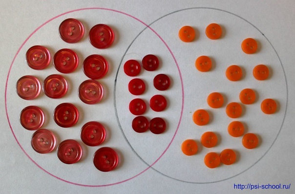 а) разложи пуговицы: красные в один круг, маленькие в другой;
