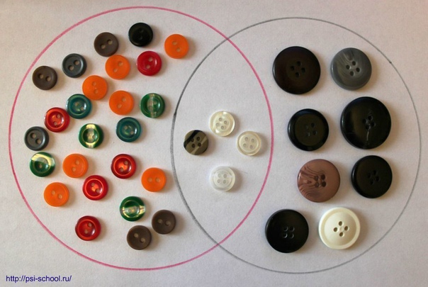 б) разложи пуговицы: с 4 отверстиями в один круг, маленькие в другой.