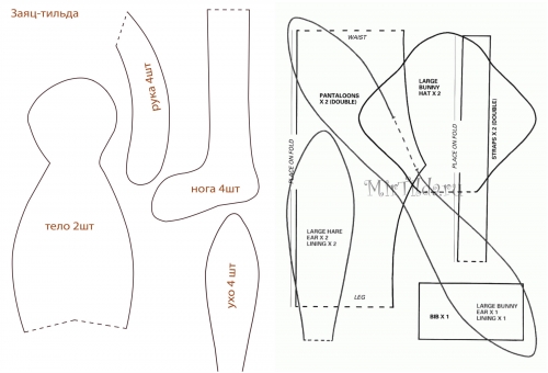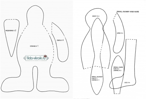 Ниже вы найдете четыре варианта схемы выкройки для зайчика. Можете выбрать любую, или сшить все 4 зайца и посмотреть в чем их отличия. Для начала вам нужно вырезать из плотного картона каждую деталь выкройки. Далее прикладывайте делать к ткани, обводите ручкой и вырезайте с отступом в 0,5 см для шва.
