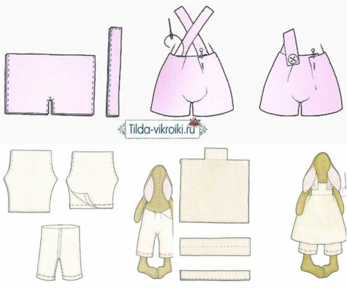 Ну и в заключении подумайте как бы креативно одеть вашего зайца или зайчиху. Тут показаны несколько вариантов выкроек различной одежды. Это могут быть шорты, штаны, платье, юбочка и другие детали одежды. Выбирайте себе по вкусу.