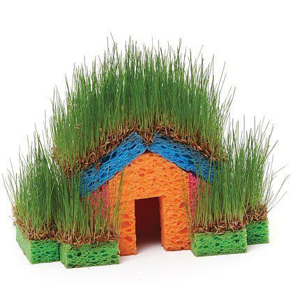 Внутри пластикового контейнера, собрать дом. Пульверизатором смочить дом. Затем посыпать щедрым слоем семенами трав, равномерно, по крыше и во дворе. Если семена скатываются с крыши, нужно утопить их в порах губки. Еще раз смочить дом с семенами из пульверизатора.