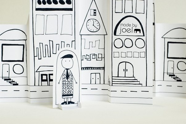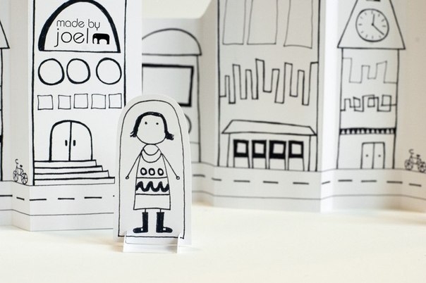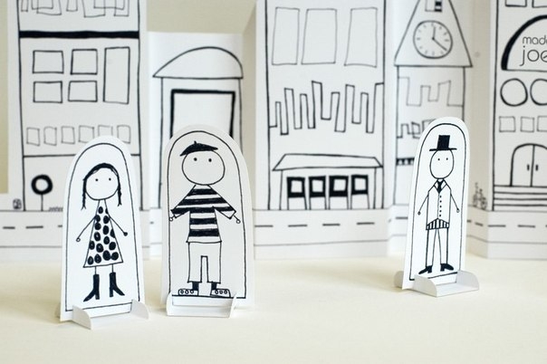 Если вы более-менее умеете рисовать, то сможете подарить ребенку совершенно любой городок в его бумажном варианте. Как это делает художник Джоэль Энрикес для своих детей. Он не создает сложных распечаток в виде коробочек, прямоугольников, многогранников. Он делает городские объекты и людей в том числе просто: