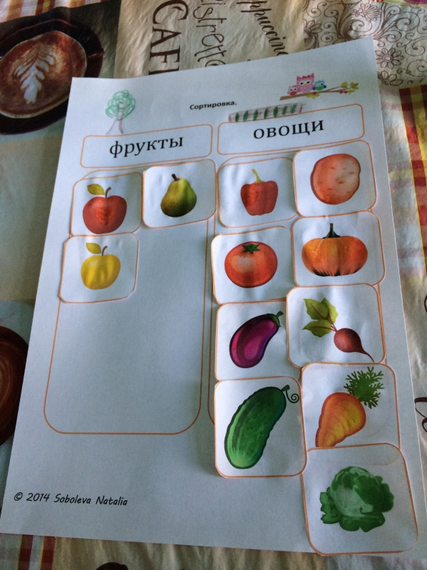 Начинаем распределять картинки фруктов и овощей. Приклеиваем их.