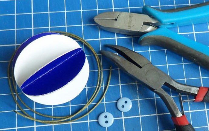 7) Дальше отрезаем вощеный шнур кусачками под углом! Для диаметра шарика 4 см лучше всего подойдет 40 см шнура. Готовим 2 пуговки.