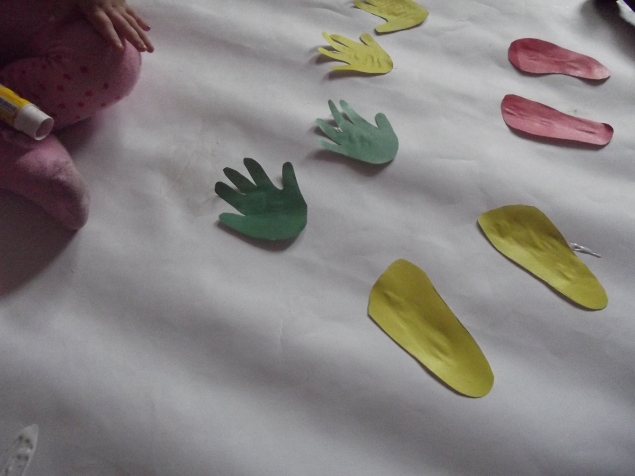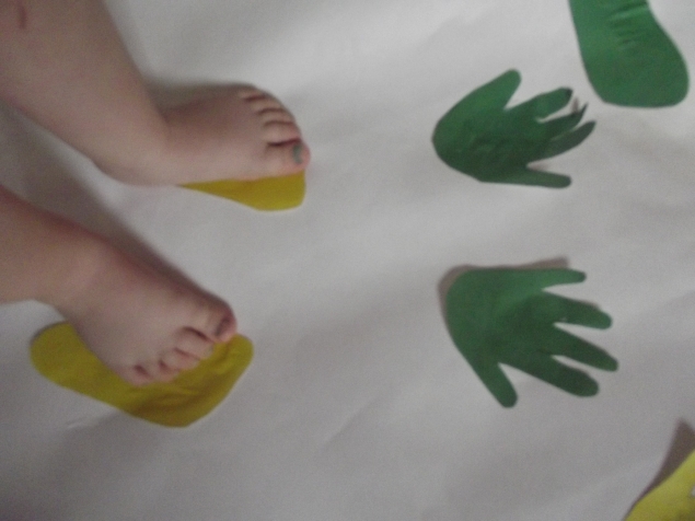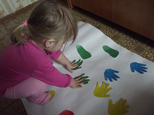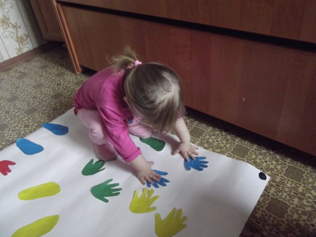 Для игры мы обвели ножки и ладошки на цветной бумаге . Вырезали наши отпечатки и наклеили на большой лист ватмана . Наклеивать можно как угодно . Все ! Играть в самодельный твистер дочке было очень весело !