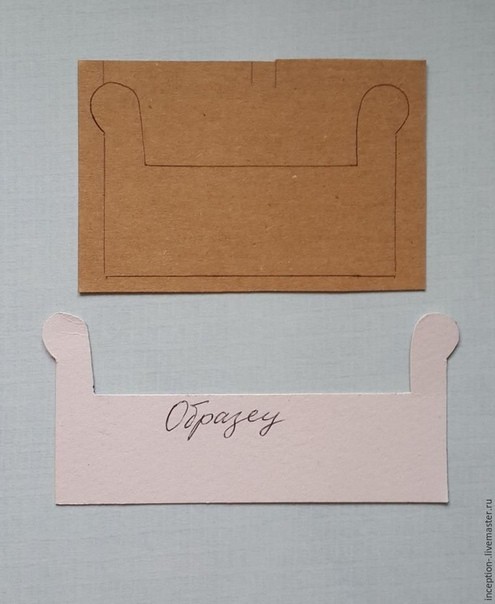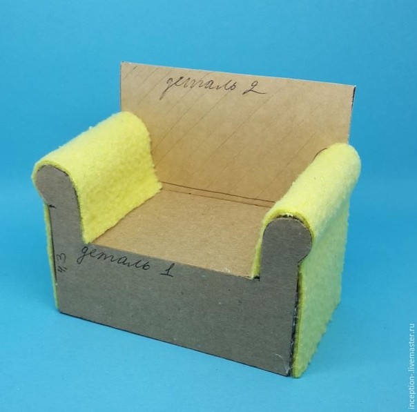 Пришло время детали номер четыре, нужно приложить её к диванчику и тщательно проверить, соответствует ли она получившейся модели, если есть необходимость деталь номер четыре можно переделать — уменьшив или увеличив в нужных местах. То есть, она должна полностью скрыть все «некрасивости».