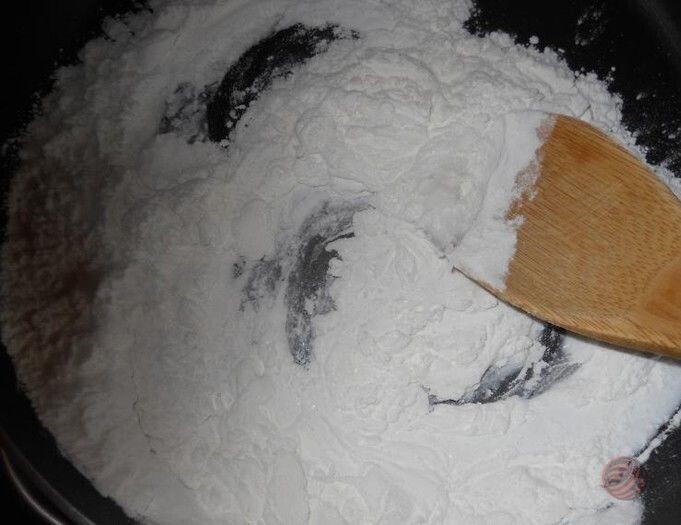 6. Когда сковорода станет теплой, но не горячей, появятся первые пузырьки, тогда высыпаем половину стакана крахмала и интенсивно перемешиваем, затем вторую часть и мешаем, не останавливаясь.