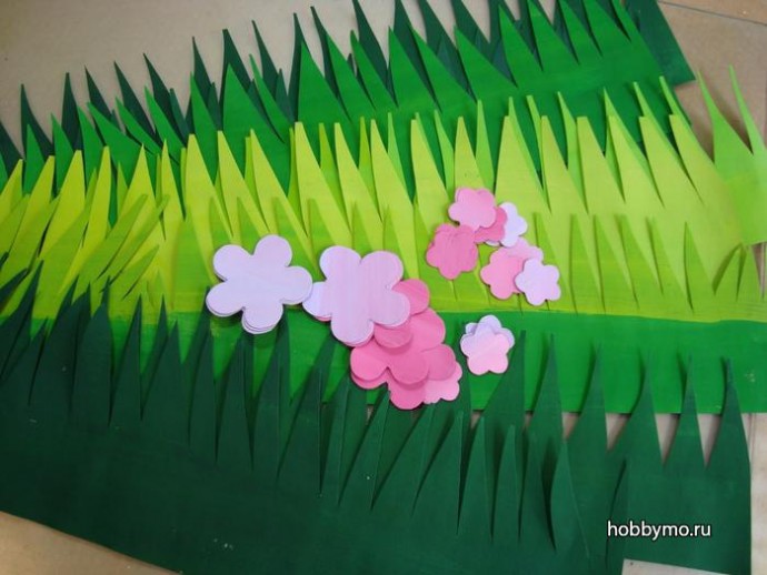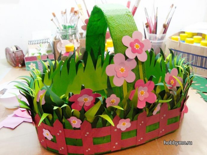 Картонная корзинка с объемными цветами и травушкой-муравушкой