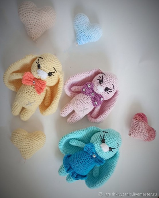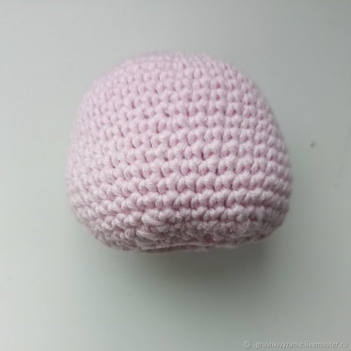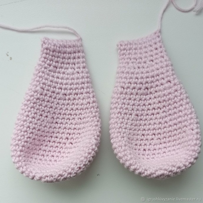 6 сбн в КА; 6 пр (12); (1сбн, пр)*6 (18); (2 сбн,пр )*6 (24); (3 сбн, пр)*6 (30); (4 сбн, пр )*6 (36); (5 сбн, пр )*6 (42); 8-11. 42 сбн; 12. (5сбн,уб)*6 (36); 13-16 36 сбн; 17. (4 сбн, уб)*6 (30); 18-21 30 сбн; 22. (3 сбн, уб)*6 (24); 23-26 24 сбн; 27. (2 сбн, уб )*6 (18); 28-31 18 сбн. Складываем наше ушко пополам и провязываем 9 сбн. Обрезаем нить, оставляя длинный конец для пришивания.