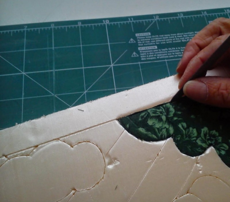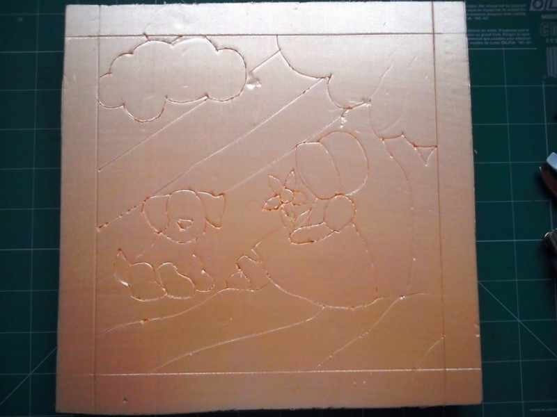 Канцелярским ножом или скальпелем прорезаем весь рисунок по линиям на пенопласте глубиной примерно 3 мм.