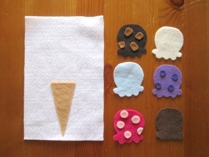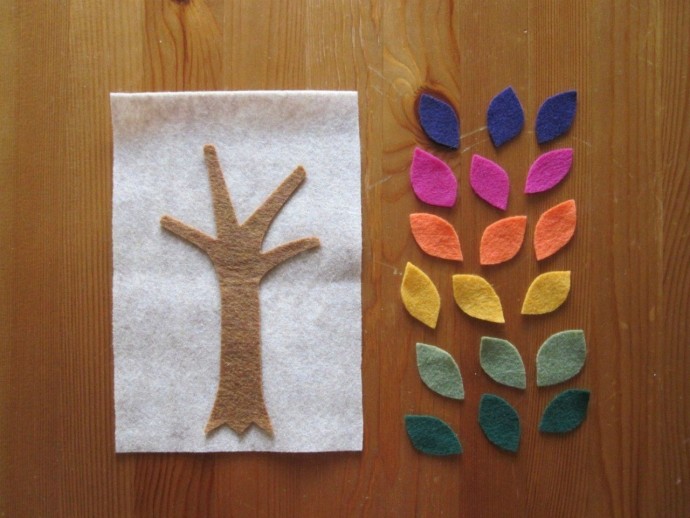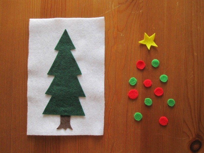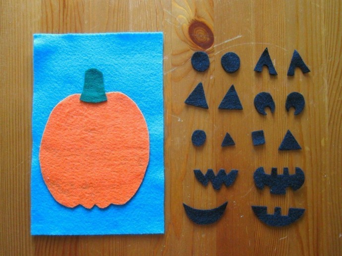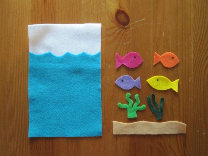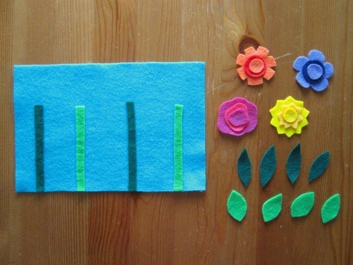 1. Отрежьте половину листа фетра и приклейте на него элементы фона.