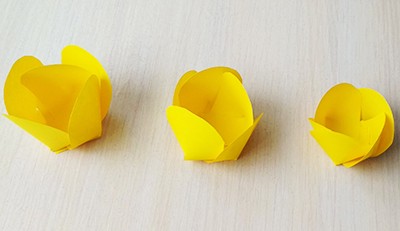 На нижний ярус цветка (основа – прямоугольники 4 на 7 см.) приклеим средний ярус ( основа — прямоугольники 4 на 6 см.) . Затем приклеим самые маленькие лепестки (основа – прямоугольники 4 на 5 см.).
