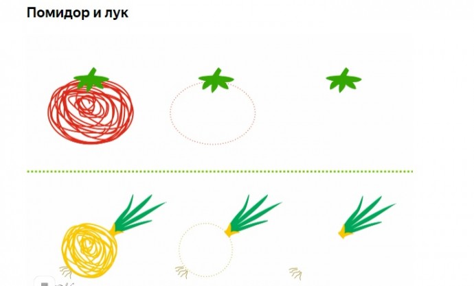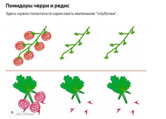Учимся рисовать круги, овалы на примере овощей. Первый пример - образец, второй - обвести по пунктирным линиям, третий - нарисовать самому, ориентируясь на подсказки.