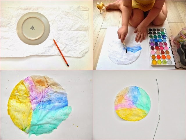 Окрашенные круги оставляем сохнутьКогда листы высохнут, пронзаем их проволокой, верхний конец проволоки скручиваем ножницами.