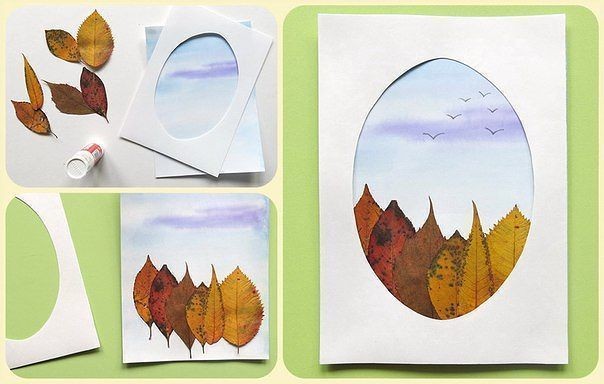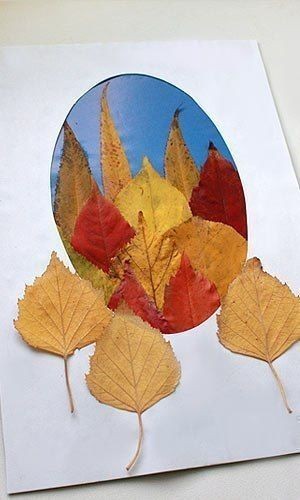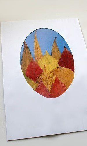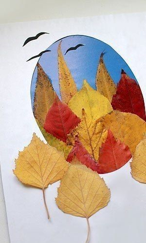 Открытка с использованием разноцветных осенних листьев может превратиться и в панно, которое украсит дом и станет гордостью семьи.
