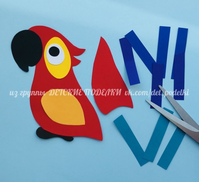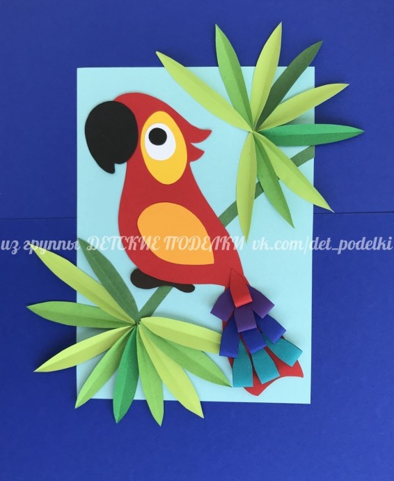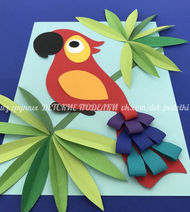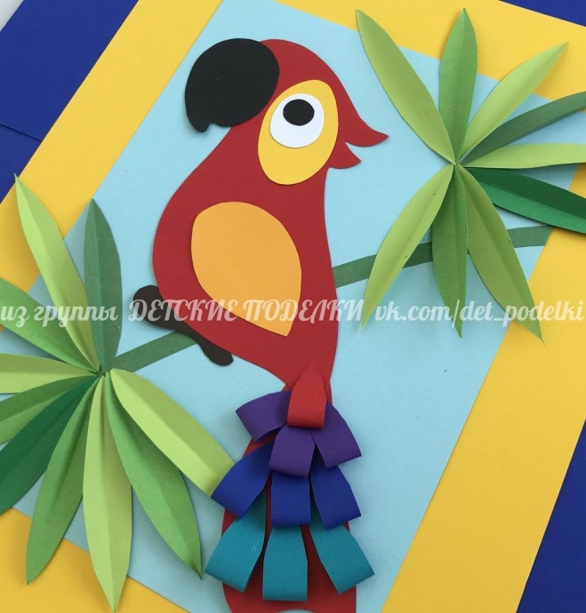 Бумажная аппликация поделка «Попугай» настолько жизнерадостно яркая,