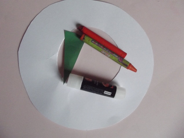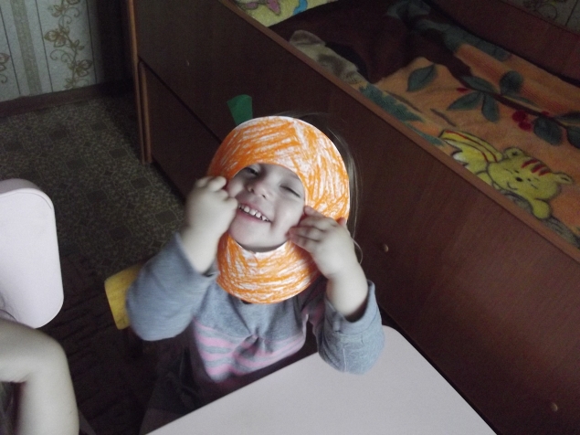 Я вырезала из бумаги кольцо . Девочки раскрасили его в оранжевый цвет . Приклеили хвостик из зеленой бумаги . Готово ! Сзади можно продеть резиночку .