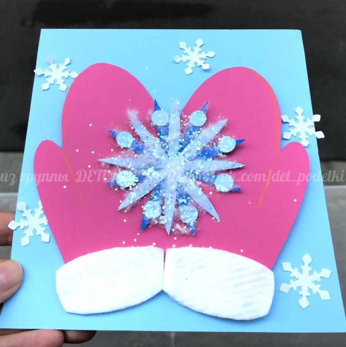 Зима на ладошках Зима на ладошках Отвороты на рукавичках - из ватных дисков, пушистость снежинке придала с помощью ваты.