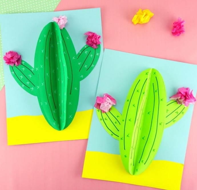 Кактус из бумажных полосок: часть 3 Кактус из бумажных полосок: часть 3 Автор Куриганова Ольга Викторовна. Склеиваем по середине полоски Концы полосок приклеиваем к середине Получился цветок с восемью лепестками Зеленый шар - это стебель, а желтый - цветок Приклейте цветок к шару Для горшочка и земли нам понадобится В пластиковую крышку вкладываем пластилин Из полосок желтой бумаги нарезаем мелкую "стружку" - это иголки кактуса Наносим клей на торец стебля Приклеиваем... Кактус из бумажных полосок: часть 2 Кактус из бумажных полосок: часть 2 Автор Куриганова Ольга Викторовна. Склеиваем полоски посередине крестиком Склеиваем противоположные концы полоски При изготовлении в таком порядке шар не изменит форму Получился шар - стебель цветка готов На двусторонней бумаге зеленого цвета отмеряем 4 полоски шириной 0,5 см Отрезаем Часть 1 https://www.detkipodelki.ru/pages/23200.html Часть 2 https://www.detkipodelki.ru/pages/23208.html Часть 3 https://www.detkipodelki.ru/pages/23224.html ... Кактус из бумажных полосок: часть 1 Кактус из бумажных полосок: часть 1 Автор Куриганова Ольга Викторовна. У этого кактуса золотистый цветок и яйцевидный стебель, покрытый прилегающими к нему желтыми колючками. Начнем с изготовления стебля кактуса На двусторонней бумаге зеленого цвета при помощи линейки отмеряем 4 полосы шириной 0,5-1 см Отрезаем Складываем полоски пополам, находим середину Часть 1 https://www.detkipodelki.ru/pages/23200.html Часть 2 https://www.detkipodelki.ru/pages/23208.html Часть 3 https://www.detkipode... Цветущий кактус Цветущий кактус Колючки просто нарисуйте черным маркером. Шьём кактусы из фетра Шьём кактусы из фетра Автор lunabeehive. 1 Кактусик крючком Кактусик крючком Автор: TWINSPSINS. Подробное описание процесса вязания находится ниже. Объемная аппликация из цветной бумаги "Кактус" Объемная аппликация из цветной бумаги "Кактус" Автор: Елькина Надежда Александровна Необходимый материал: цветной картон, цветная бумага, заранее изготовленные шаблоны (цветочный горшок, овал для кактуса, цветок), клей, простой карандаш, ножницы. Изготавливаем цветочный горшок. На лист цветной бумаги прикладываем шаблон горшка, обводим карандашом и вырезаем. Полученную деталь сгибаем вдоль несколько раз, чтобы горшок был с гранями. Намазываем клеем крайние грани и приклеиваем на лист цветного... Кактусята из пряжи Кактусята из пряжи Подробное описание процесса вязания смотрите ниже. Кактус из бумаги Кактус из бумаги Вырезаем из зеленой бумаги овалы, сгибаем пополам, склеиваем боковинами. Между ними проклеиваем красные колючки. На вершине приклеиваем красные цветы. Вязаный кактус Вязаный кактус Кактус, спрячь свои иголки, Ведь они остры и колки, И острей даже копья. Вдруг пораню пальчик я? Милая открытка "Кактус" Милая открытка "Кактус" Этот кактус милый потому, что не колется. Цветущий кактус Цветущий кактус Цветущий кактус это синергия картонной втулки и цветной бумаги. Творите с детьми и будьте счастливы. Кактус из цветной бумаги Кактус из цветной бумаги Он – на ёжика похож, Но цветок он, а не ёж. Знаю точно, кактус тоже Зацвести красиво может. 1 Кактусы из фетра Кактусы из фетра Кактусы из фетра в золотых руках ребенка могут превратиться в закладки для книг, брелки и даже небольшие подушки-думочки. Творите с детьми и будьте счастливы, наши дорогие. Кактусы из двухстороннего цветного картона Кактусы из двухстороннего цветного картона Замените клеевой пистолет вашим 