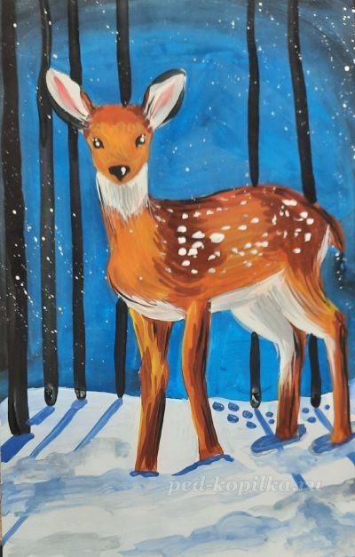 Погремушка "Оленёнок" Погремушка "Оленёнок" Автор: arevik_toys. Олененок и цветы Олененок и цветы Пятнистая окраска тела помогает оленёнку маскироваться в окружающей среде. На первых порах это основная защита детёнышей. Оленёнок в лесу Оленёнок в лесу Расскажите заодно детям об охране животных. Рисование сказочного оленя: часть 2 Рисование сказочного оленя: часть 2 Автор Средина Ольга Станиславовна. Добавляем правые ноги. Наш олень никуда не бежит и постановка ног спокойная. Приступаем к рисованию сказочных, волшебных, необычных рогов животного. Сразу задаем их размер. Добавляем копытца, ухо и хвостик Передняя часть рогов загибается в другую сторону. Она будет короче. Добавляем сказочные отростки –веточки в виде завитков Рисуем елочку и кустик, используя те же завитки. Ими же намечаем сугробы. Волнистой линией дополняем ... Рисование сказочного оленя: часть 1 Рисование сказочного оленя: часть 1 Автор Средина Ольга Станиславовна. Создаем фон. Он будет смешанным. Наносим на губку несколько оттенков голубой и синей гуаши. Горизонтальными движениями по влажному листу распределяем эти цвета. Ждем, когда лист немного подсохнет и кистью рисуем рамку, отступая примерно два сантиметра с каждой стороны. Используем синюю или фиолетовую гуашь. Работаем кистью, как карандашом, намечая контуры будущей фигуры животного. Сначала рисуем овал туловища, затем небольшой ... Урок рисования оленя в зимнем лесу: часть 3 Урок рисования оленя в зимнем лесу: часть 3 Автор: Носова Наталья Викторовна Напишем оленя. Тело оленя покрыто густым мехом поверх шерсти — это обеспечивает защиту от сильных морозов. Наш олень будет оранжевого оттенка, но не забываем про белые пятнышки. Далее добавим желтый цвет – на мордочку, ушки, грудку, ноги и хвост, так как мы рисуем поверх оранжевого желтый цвет перемешается с оранжевым и оранжевый станет светлее. Далее добавь тень на олене – коричневым цветом. Рисуем коричневы ц... Красавец-олень: часть 2 Красавец-олень: часть 2 Автор: Французова Ольга Александровна Немного добавим фиолетового цвета для выразительности. Теперь нужно подождать, чтобы фон картины высох полностью. Когда фон высохнет, обводим простым карандашом контуры оленя и холма. Берем кисточку среднего размера и закрашиваем краской черного цвета силуэт оленя и холма. Ждем, пока высохнет. И все. Красавец готов. Можно украшать мамин интерьер. Часть 1 https://www.detkipodelki.ru/pages/22998.html Часть 2 https://... Урок рисования оленя в зимнем лесу: часть 2 Урок рисования оленя в зимнем лесу: часть 2 Автор: Носова Наталья Викторовна После чего утемним небо по краям, для этого берем черный цвет и закрашиваем края рисунка. Чтобы получился плавный переход от синего к черному, необходимо взять кисть и водичкой размыть границу между черным и синим цветом. Рисуем снег. Основной цвет снега – это белый, а теперь давайте внимательно рассмотрим картину А. Саврасов "Зимняя дорога", чтобы понять, какие цвета он использовал, чтобы написать белый снег. Присту... Красавец-олень: часть 1 Красавец-олень: часть 1 Автор: Французова Ольга Александровна Сначала изготовим трафарет. Берем лист плотной бумаги и рисуем контуры оленя и холма. Если кто не умеет хорошо рисовать, можно распечатать на принтере. Теперь вырезаем контуры оленя – трафарет готов. На палитре разводим водой фиолетовую, красную и оранжевую краски. Больш