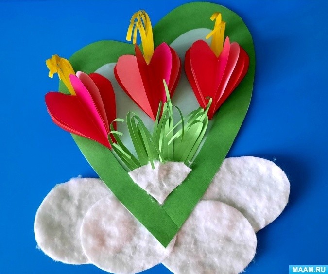 Поделка из цветной бумаги: коровка Поделка из цветной бумаги: коровка Она выполняется как плетенка. Зимняя поделка из цветной бумаги Зимняя поделка из цветной бумаги Домик, снеговик, снег, звезды - настоящая зимняя ночь. Весенняя поделка из цветной бумаги и ватных дисков Весенняя поделка из цветной бумаги и ватных дисков Ватные диски имитируют тающий снег.