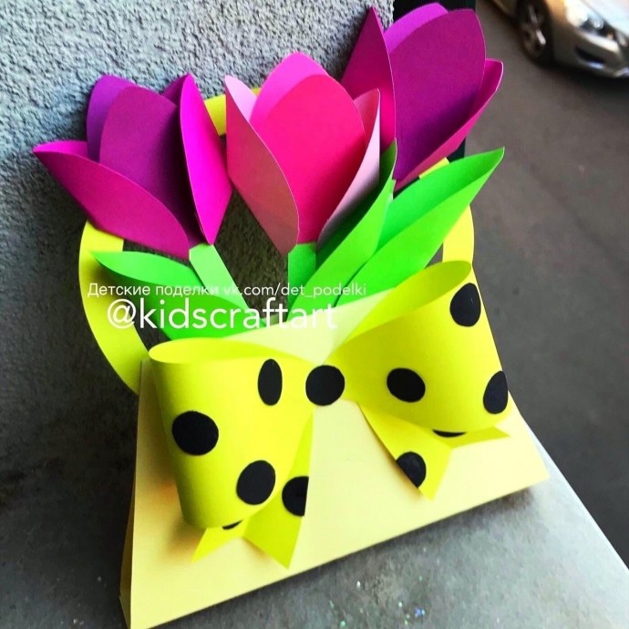 Букет весенних тюльпанов Букет весенних тюльпанов Таким цветам будут рады и мама, и бабушка. Ваза с тюльпанами из соленого теста: часть 2 Ваза с тюльпанами из соленого теста: часть 2 Автор: Князева Ирина Анатольевна Приклеиваем клеем «Мастер». Верхнюю часть сеточки приклеить внутри стаканчика, нижний край отрезать. Низ вазочки украшаем тонкими атласными ленточками. Из ленточек завязываем два бантика и крепим, с помощью клея на вазочку. 4. Развести гипс до густоты сметаны и залить в форму. Затем туда же воткнуть зубочистки с цветами. Дать время застыть гипсу. 5. Зеленое тесто раскатываем тонко (2 мм) и формочкой-листком вырезае... Ваза с тюльпанами из соленого теста: часть 1 Ваза с тюльпанами из соленого теста: часть 1 Автор: Князева Ирина Анатольевна Материалы: 2 цвета соленого теста – зеленый, красный; клей ПВА; кисть; формочка-листок большая; лопаточка (можно пользоваться и стеком); скалка; доска для раскатывания теста; чашка (я использовала стаканчик от йогурта); зубочисток 9 штук; гипс; канцелярский нож. Изготовление формочек: Из пластиковой бутылки вырезать пластинку, от которой отрезать полоску: 0,5см на 7 см (для большой формочки-листка) Концы полос... Тюльпаны Тюльпаны Автор: Леонтьева Полина Для изготовления открытки необходимо приготовить: картон жёлтого цвета, бумагу двустороннюю красного и зелёного цвета (формат А 4), карандаш ножницы, линейка, клей ПВА, клеевой пистолет, узкая атласная ленточка, картонный трафарет для цветов и листьев (можно нарисовать самим или распечатать на принтере и вырезать). Трафарет для цветов и листьев (распечатать на принтере). Порядок выполнения работы: 1. Лист красного цвета разделить вдоль на три части, шириной 6,5 с... 1 Тюльпаны любимой маме Тюльпаны любимой маме Автор: Волкодаева Валерия Для изготовления поделки понадобится: прямоугольник из картона с рисунком размером 20х16 см, прямоугольник из желтой бумаги размером 18х14 см, три прямоугольника из красной двусторонней бумаги размером 7,5х4 см, зеленая бумага, карандаш, ножницы, фигурные ножницы, клей-карандаш. Порядок выполнения работы: 1. Складываем красные прямоугольники пополам. 2. Складываем стороны полученных прямоугольников пополам наружу. Получаем "гармошку". ... Тюльпаны Тюльпаны Автор: Леонтьева Полина. Трафарет для цветов и листьев (распечатать на принтере). Порядок выполнения работы: 1. Лист красного цвета разделить вдоль на три части, шириной 6,5 см. 2. Каждую полосу условно разделить на 3 части и свернуть пополам. 3. К линии сгиба приложить половинку трафарета и обвести. 4. Из каждой полосы при вырезывании получается 3 симметричных детали одного махрового тюльпана. 5. Линию сгиба одной заготовки промазать полоской клея, приложить вторую и тре... Аппликация "Тюльпаны" в технике квиллинга Аппликация "Тюльпаны" в технике квиллинга Автор: Магамадова Имани Салмановна Необходимые материалы: Полоски для квиллинга или двухсторонняя цветная бумага,белый лист бумаги формата А3, простой карандаш, ножницы, клей, бусинки для украшения. Процесс: Подготовьте полоски для квиллинга или вырежете из цветной бумаги полоски по 0.5 см. Для бутона светло-разовые, листва и стебли зеленый. Полоски розгового цвета по очереди и скручиваем на простой карандаш. Для работы нам понадобятся спиральки разн... Тюльпаны из ткани Тюльпаны из ткани Готовые тюльпаны набиваем синтепоном и